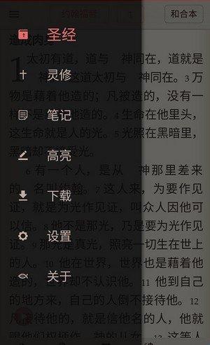 2、点击首页左上角,用户可以看到圣经、灵修、做笔记和设置等选项。