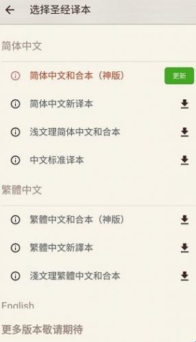 若要切换已下载的译本,点击即可完成。对于未下载的译本,需点击译本名称右侧的下载图标,待下载完成后,方可进行切换。