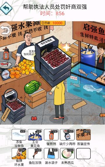 4、透过放大镜观察:水果摊招牌写着不要一半的钱,水果摊老板却在偷偷调换坏水果,而且西瓜还没成熟。