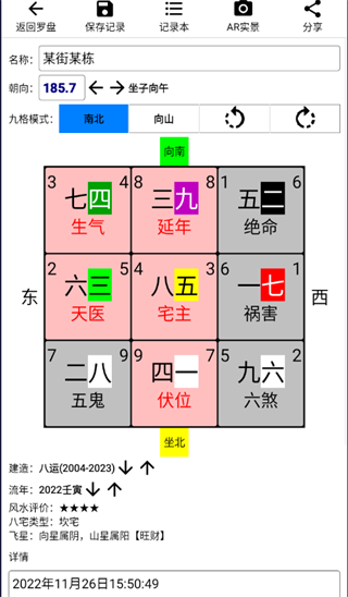 4、放置罗盘后,一键即可分析八宅布局、九宫飞星以及流年情况,系统会自动识别天医、生气、延年、伏位、五鬼、六煞、祸害、绝命等方位。点击“VR实景”,系统便会自动为真实场景添加上方位属性标签。