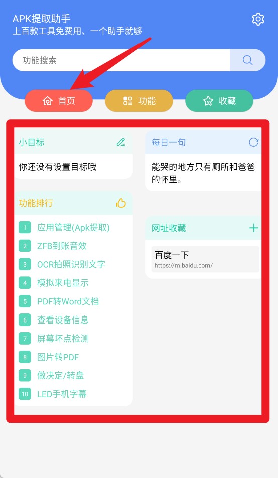 2. 在首页界面,你能够查看功能排行榜以及每日一句,同时还可以进行目标设置与快速添加网页收藏。