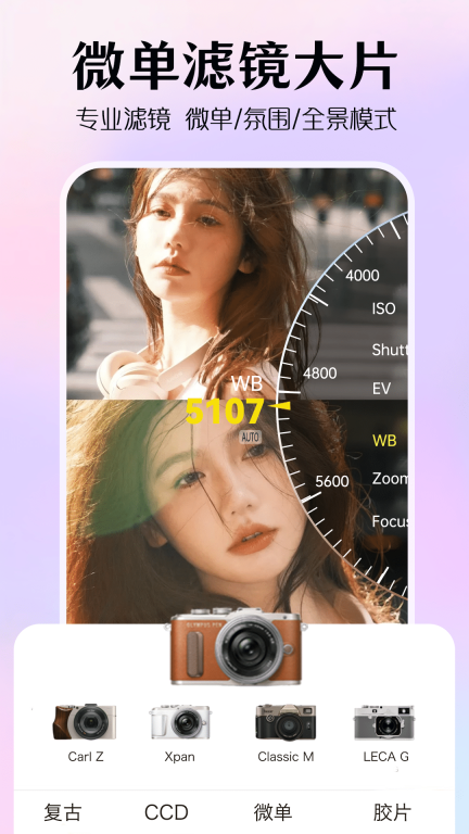 2、大家都在讲单反的拍摄效果会更出色一点。其实呢,软件里自带的微单滤镜,同样能让你瞬间拥有大片既视感。而且各种类型的单反效果都能选,直接就能让你的手机拍出微单般的效果!