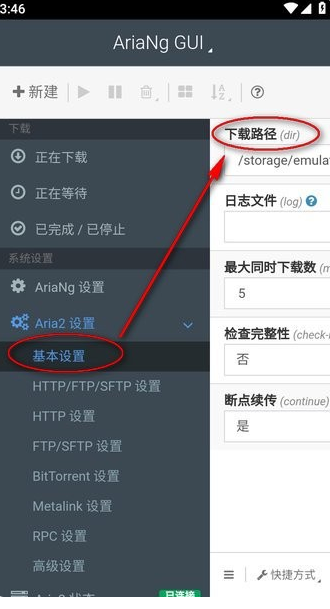 2、点击“系统设置”下的“Aria2设置” - “基本设置” - “路径” 。