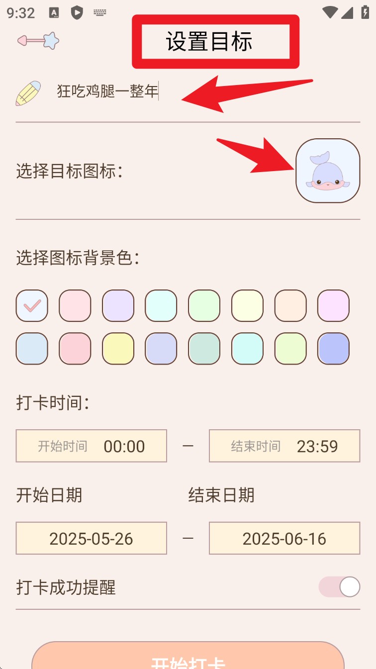 2. 于设置页面内输入目标名称,挑选图标及背景色,设定打卡时间与日期范围,最后点击「开始打卡」。
