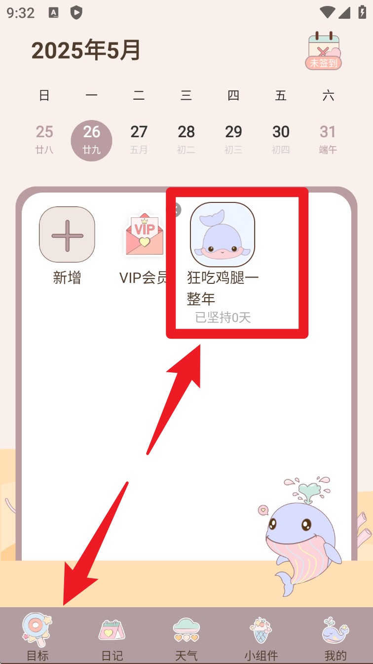 3. 返回首页,即可看到新增目标已显示在当日卡片上,点击图标,能够查看目标详情及进度。