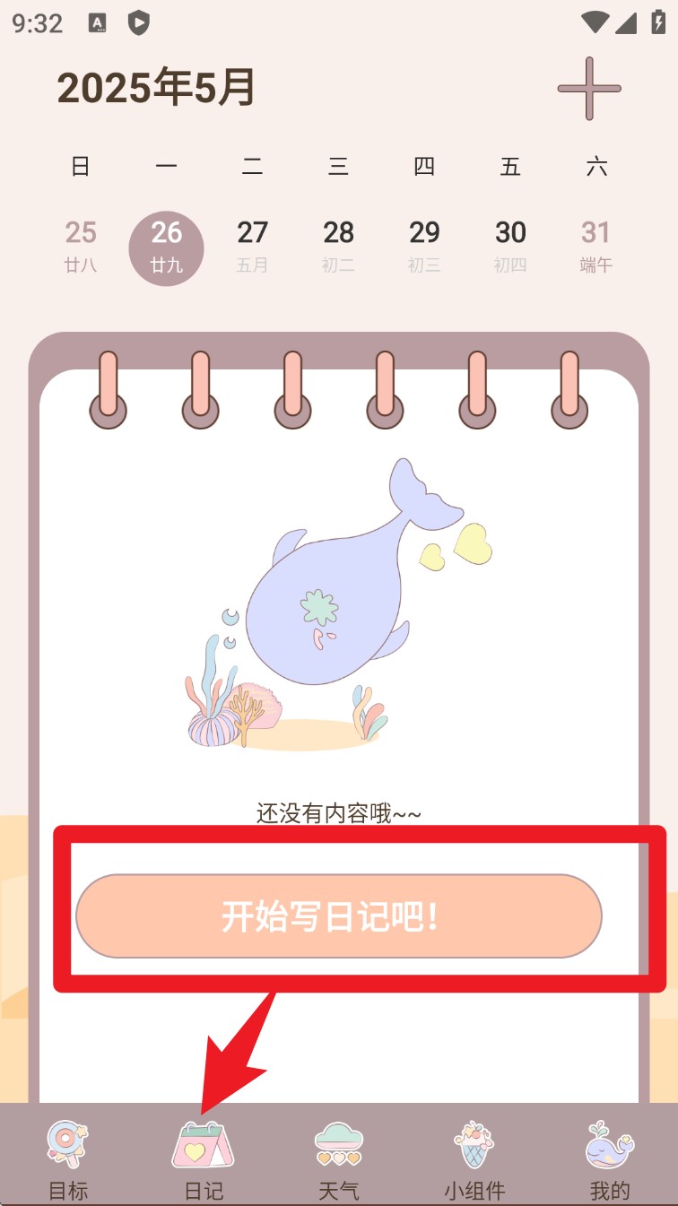4. 切换到下方的「日记」栏目,点击页面正中间的「开始写日记吧!」按钮,就能进入记录页面。