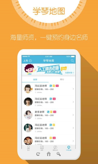 5、学琴地图,名师互动教学【弹吧钢琴】基于LBS为用户搜寻离您最近的钢琴家教,并可通过弹吧和心怡的老师随时咨询、互动,并支持在线支付学费,目前已有10000+名师入驻,粉碎学琴、教琴之间的信息屏障;诚邀名师、钢琴教育机构免费入驻,为广大学琴者提供零距离接触与体验的机会;