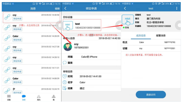 通过手机登录后,进入消息界面;在消息界面中点击消息记录,从而进入消息详情界面;于消息详情界面点击【目标设备】,就能查看设备详情。