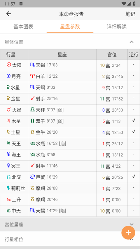 6、倘若你对星盘报告上的图标显示不太明白,既能够点击图中的图标来查看详细信息,也能点击左下角的橙色菜单进行查看。