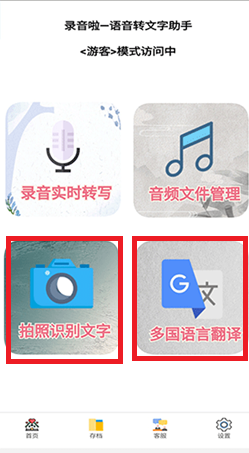 - 点击首页上的功能图标“拍照识别”或者“多语翻译”