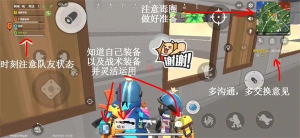 从整体策略而言,要留意自身是否处于安全区域,以及是否即将缩毒。(这条在游戏后期尤为重要,一旦吃到毒,你就会以残血状态面对敌人。)