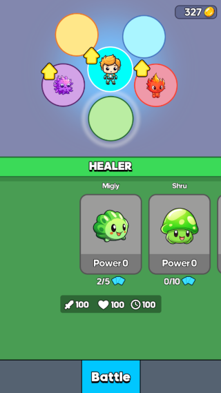 4. 如下图所示,玩家在冒险时最多可携带五个精灵角色。此外,还能消耗金币来为精灵提升等级呢!