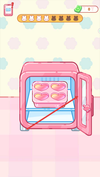 3、接着把盛有液体的爱心模具放进粉色烤箱里烘焙,待甜品在冰箱中成型。
