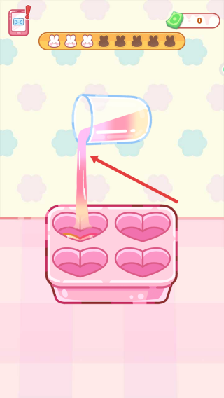 2、随后将玻璃杯内的粉色液体倒进爱心造型的模具中,使液体注满模具,以此打造出甜品的初始形态。