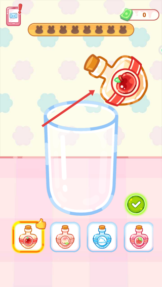 1、打开游戏,挑选印有苹果图案的瓶子,把瓶内的液体倒进透明玻璃杯里,以此备下制作甜品所需的基础原料。