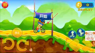 2、在“开始”旗帜的位置,通过左侧的转向按钮和右侧的箭头按钮,来操控角色骑着自行车出发。