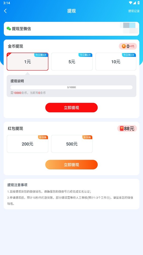 4、累积的红包与金币都可以依照一定比例来兑换。