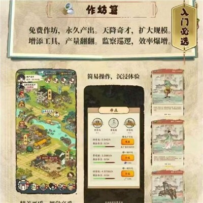 布庄、玉山、食材坊可以免费开启,通过零成本观看广告就能获取织布鸟、土拨鼠与磨稻驴,把它们分别派去对应的作坊后,每个作坊各看4个广告就能补充24小时的体力,之后布庄会产出布匹,玉山产出玉石,食材坊则产出食材。