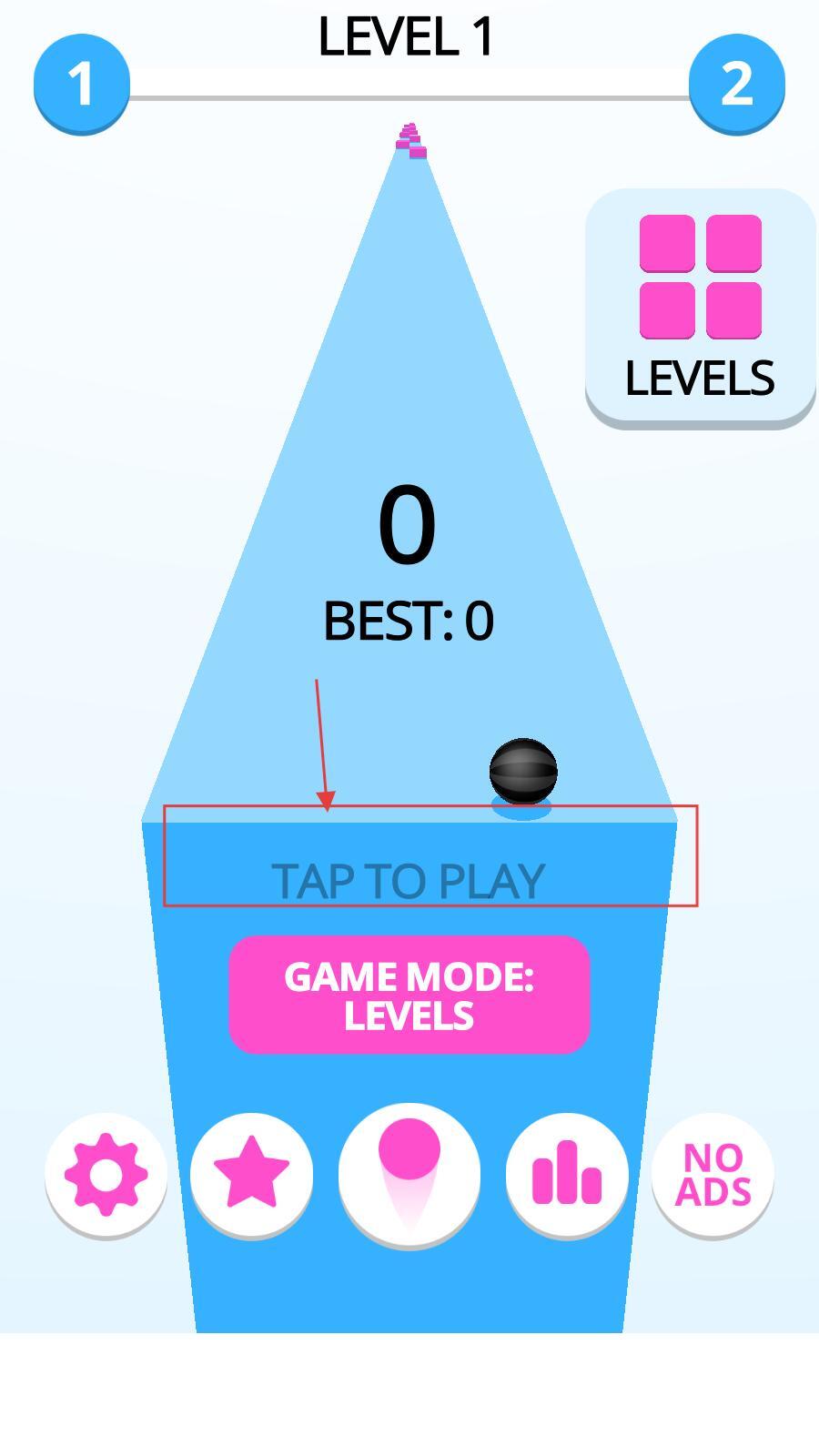 1、玩家进入游戏后,需点击“TAP TO PLAY”按钮开始游戏,游戏过程中通过左右滑动屏幕来操控黑球的移动方向。