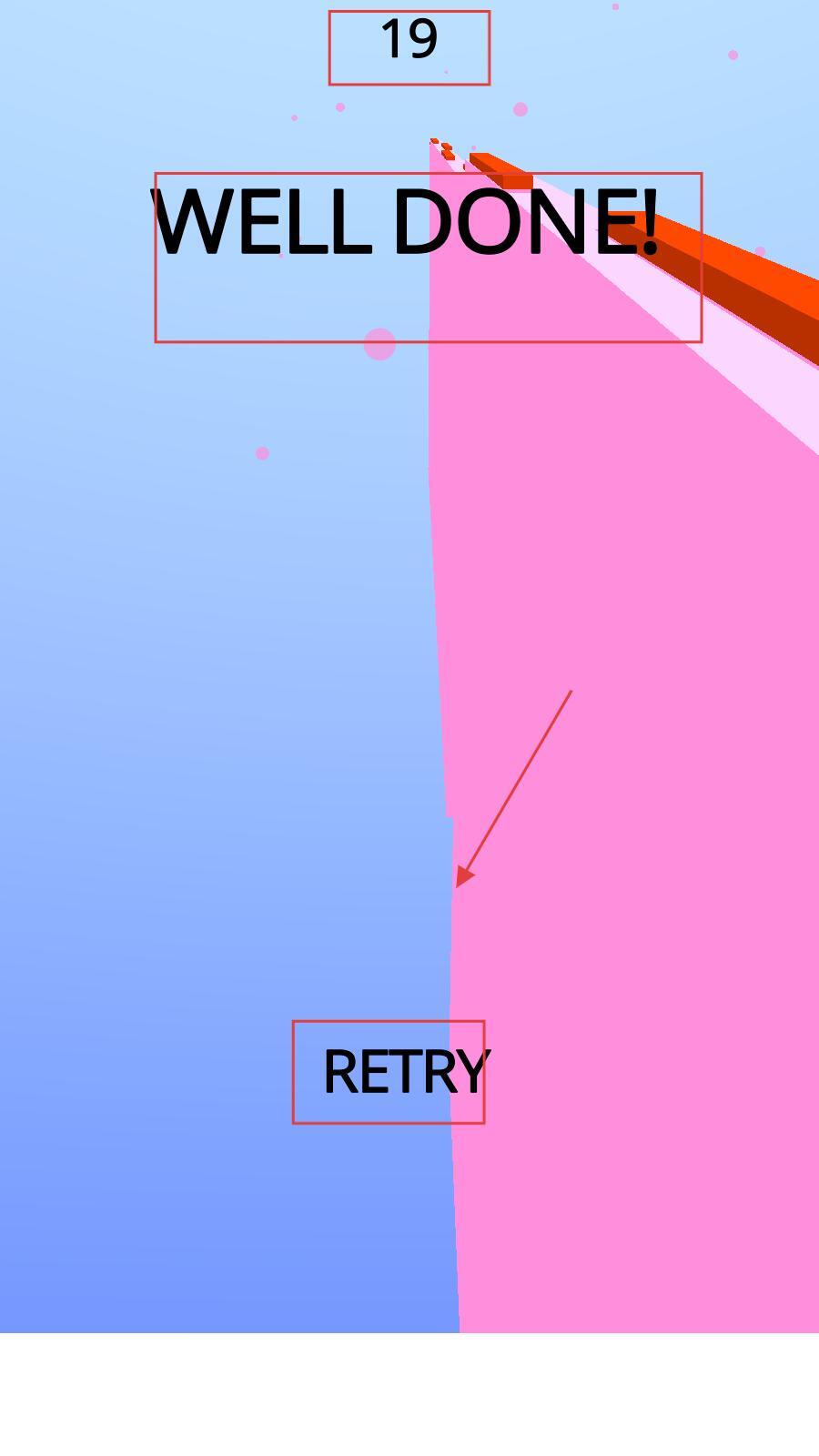 3、玩家操控的小球发生碰撞后,屏幕会显示“WELLDONE”,此时点击“RETRY”按钮即可重新开始游戏,继续挑战更高分数。
