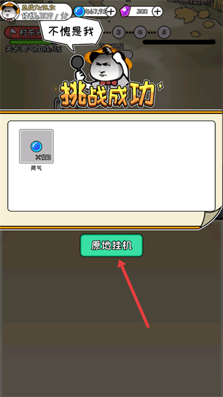 3、对战获胜后会显示【挑战成功】,并可获得【蓝色-灵气】作为奖励,点击【原地挂机】即可继续后续流程。