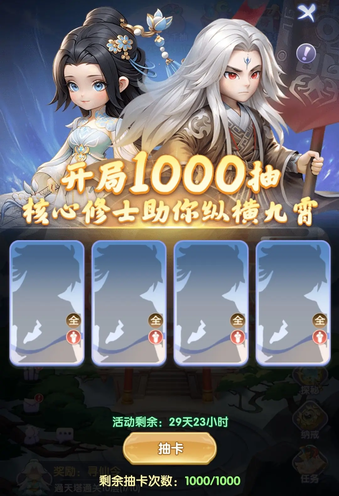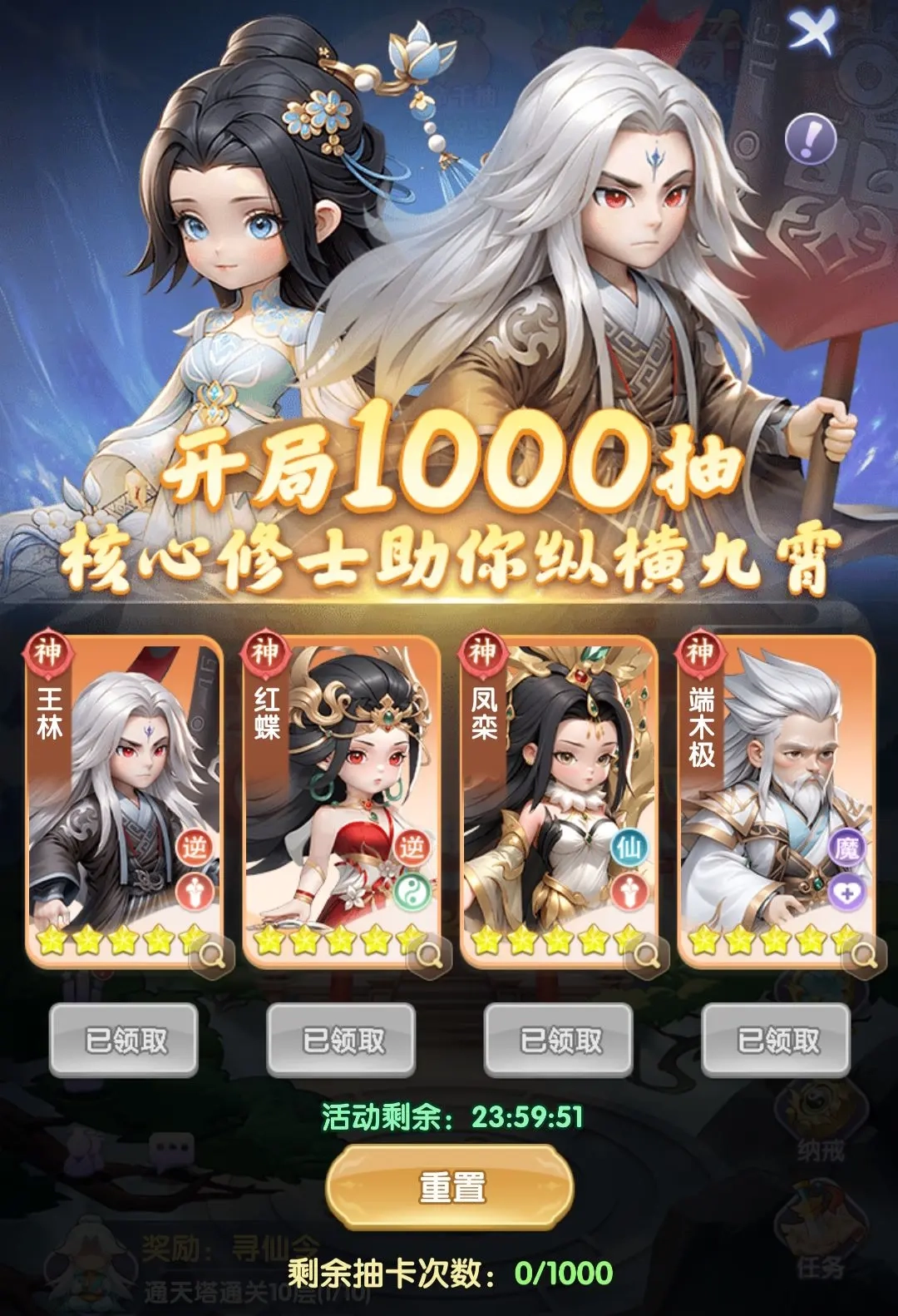 全部抽完一千次后,有抽到王林或李慕婉的,那么直接进行领取,如果没有抽到王林或李慕婉,那么在道友之前保留的其他4个S+核心修士里面选,在这4个卡里面,优先选群控群输出的神卡,比如拓森、红蝶、天运子,这些有助于道友前期快速推图过关。