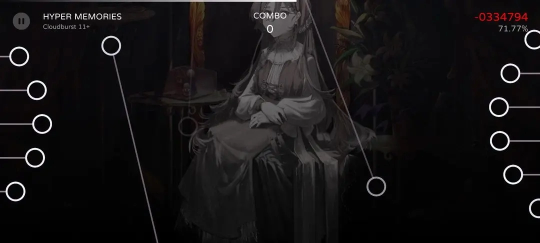 当分数变为红色且分数变为负数时,击打剩余的note增加分数使分数变为整数,成功后进入隐藏曲。