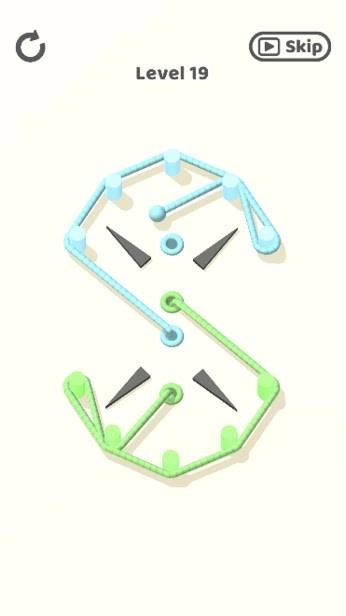 用几根不同颜色的小绳子就能设计出超多难关,画面简洁大方且物理效果十分真实,动动手指就能开启闯关挑战。场景内分布着许多小木桩,你需要将对应的绳索穿过每一个点位并固定好,过程中注意不要触碰黑色物体,等所有连线都成功完成就能通关啦。