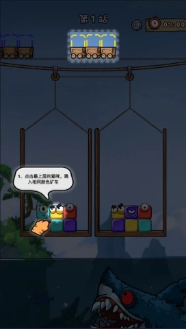 点击顶部的猫咪,使其跳进颜色一致的矿车,体验消除带来的乐趣。
