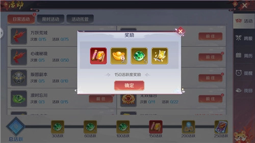 其次是每日活跃度系统,当玩家在游戏中单日活跃度达到150点时,就能领取一次心魂秘境的免费挑战机会,和使用秘典获得的次数一样,这个免费次数同样不会保留到次日。