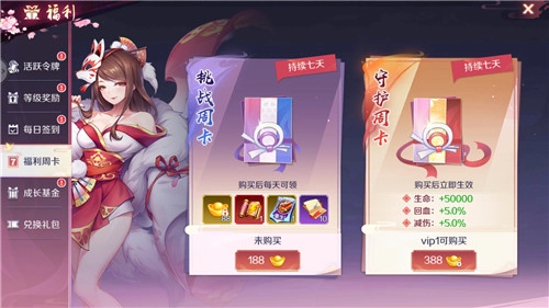 接下来要挑战的就是周卡了。周卡在游戏里得用188个非绑定元宝购买,买了之后每天都能领一次心魂秘境的免费挑战次数,还能拿到免费的boss刷新卡。