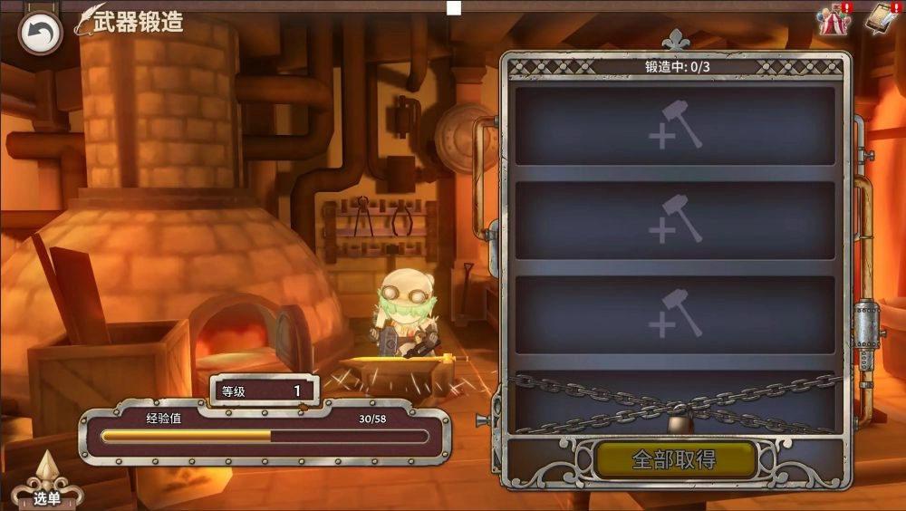 店主可借助素材与金币,打造出形形色色的武器。打造武器需占用一个锻造栏位。点击栏位后会进入锻造选择界面,确认打造后,锻造栏会显示剩余所需时间,待时间结束即可获取武器。