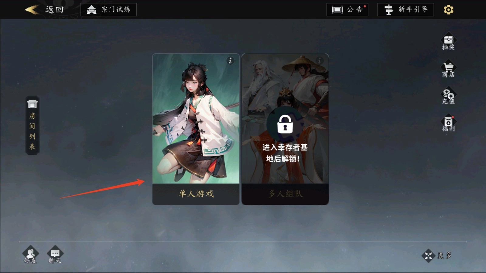 多人组队功能需要玩家先在单人游戏里达成特定目标才能解锁,点击单人模式后会看到如上图所示的界面,接着点击开始游戏即可。