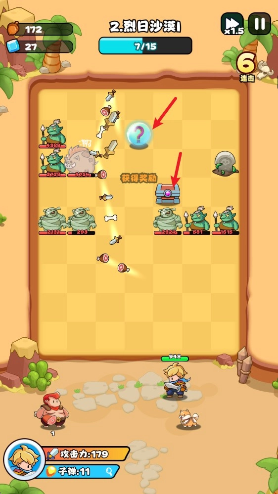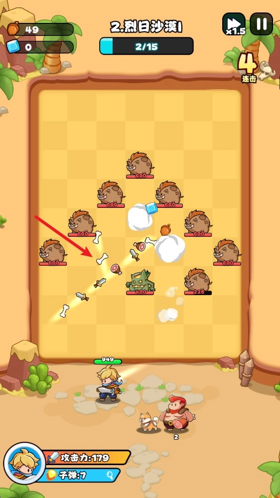 松手发射后,其他的伙伴也会跟随一起发射,发射的武器会在场地中弹射,对敌人造成伤害。