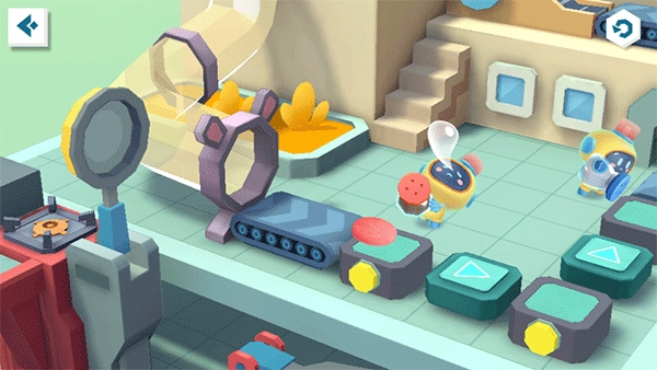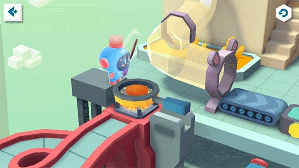 煎锅旁的机器人已经等候许久啦,宝贝快拿起锅铲弹弓,对准煎锅,把生肉块发射出去!你听,肉块在锅里发出滋滋的声响,等它熟透了就能去下一个地方咯。
