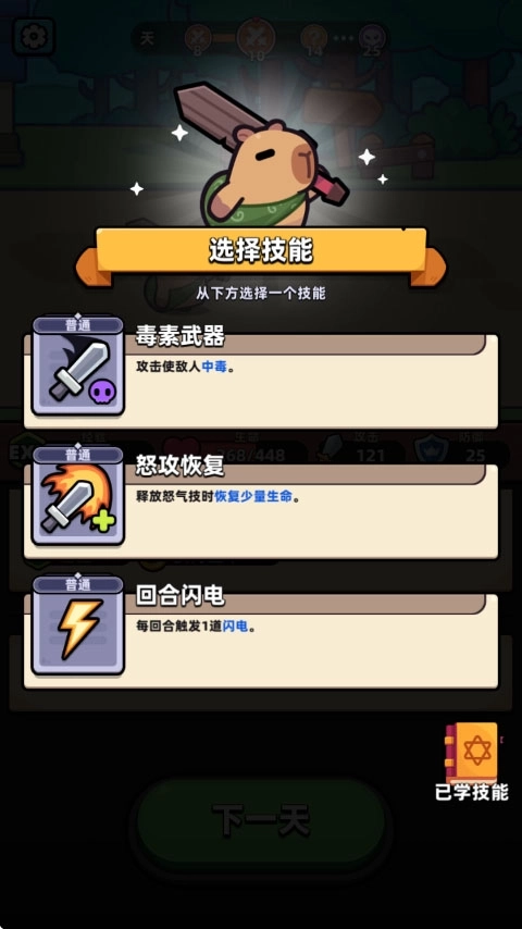 1、进入卡皮巴拉go最新版本游戏后,玩家会看到一只悠闲的卡皮巴拉,点击“下一天”即可触发事件。