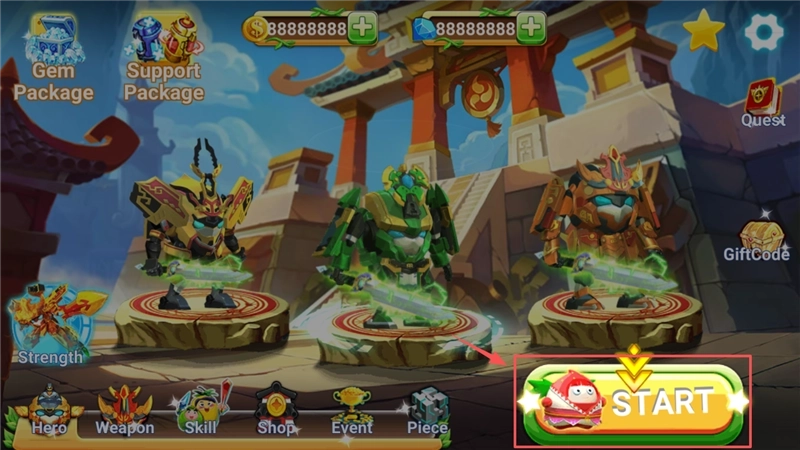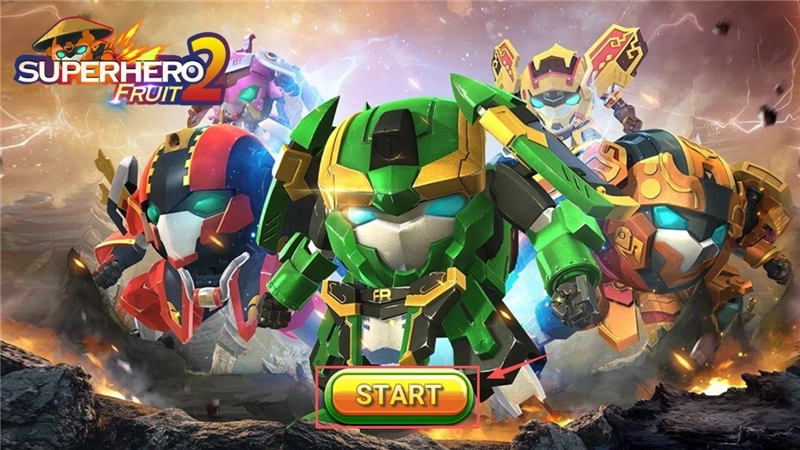 1、进入游戏后,映入眼帘的是酷炫的水果超人机甲,点击正中间那个显眼的黄色“START”按钮,就能正式开启你的冒险之旅了。