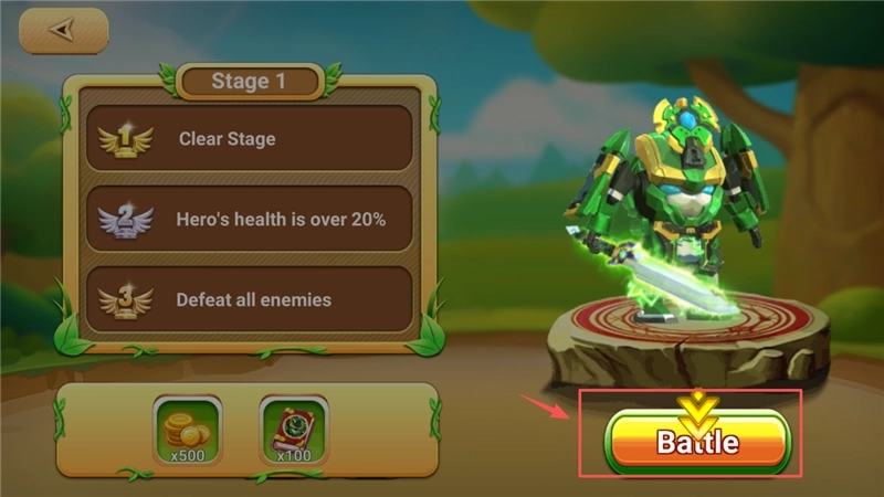 4、进入关卡后,仔细阅读“Stage1”旁的三项通关要求,确认自己的金币与道具数量,最后点击那个有特别标注的“Battle”按钮。