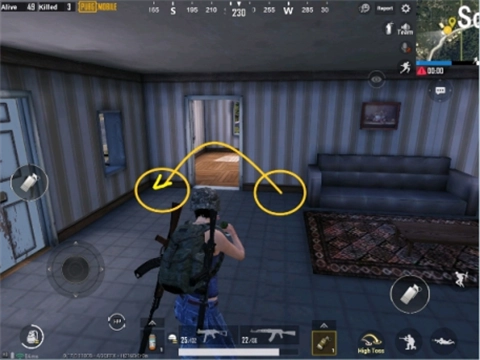 要是对方没什么动静,就径直走向右边的门口,再小跳到左边门口,把小房间里的敌人解决掉。
