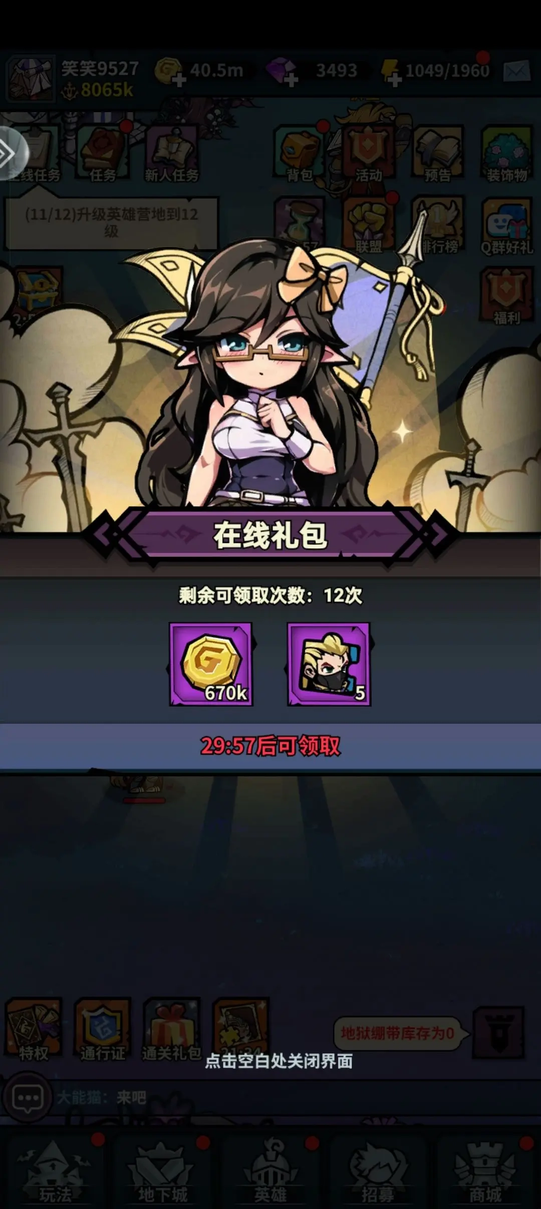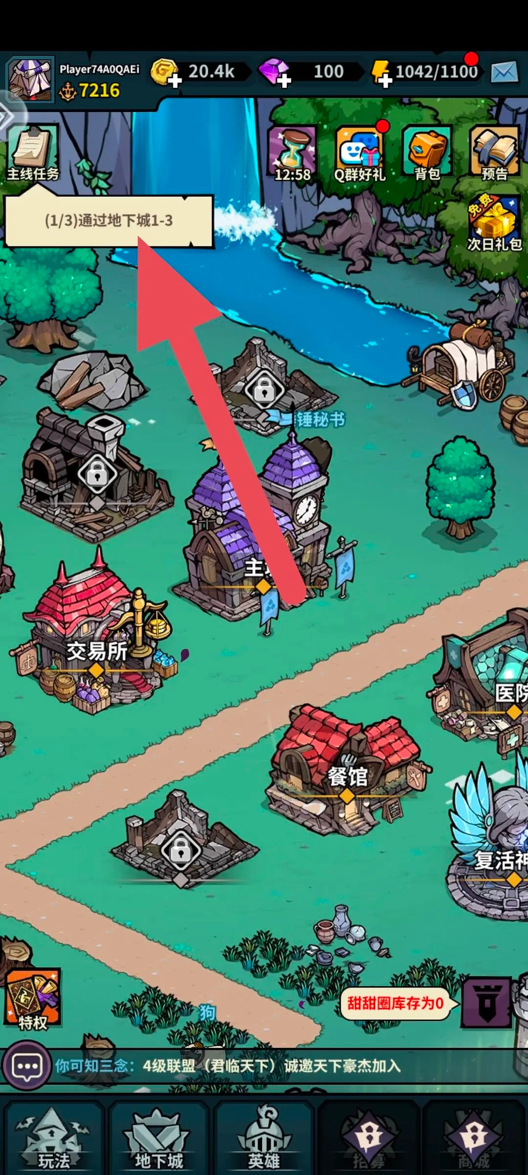 开局我们优先跟主线走(前期是被强制引导的)大家根据主线任务指引,熟悉各个建筑和如何分配英雄刷怪地点即可。