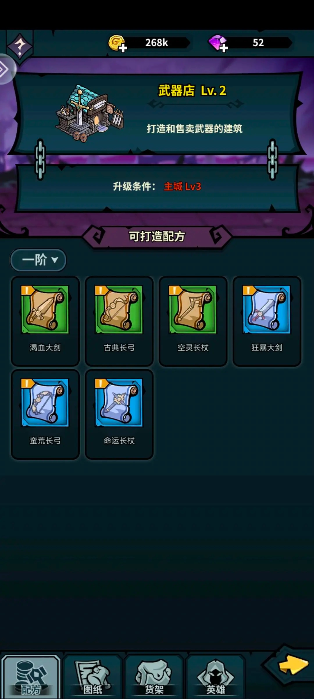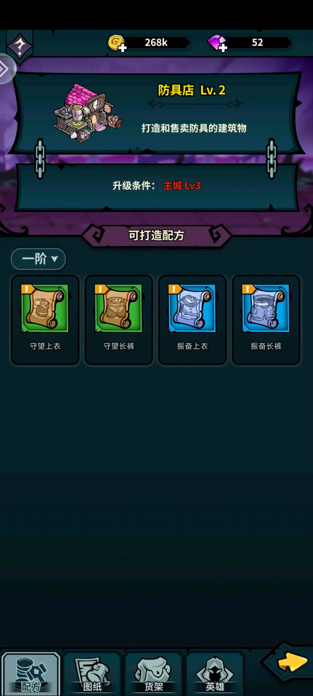 武器和防具打造:刚开始刷怪地图变得比较快,而且装备淘汰很快。所以我们不一定要全部打造满,只要能撑住抗伤就行。到第二个和第三个刷怪点且激活了第三强度了就要全套蓝装或者紫装了。(装备材料可以自己获取60s内会消失,或者在交易行收取等待时间会长一点)打造武器前要先点击英雄,查看各个英雄装备的情况,选择需要的装备。武器区分职业,战士用剑、法师用杖、弓箭手用弓,装备和首饰各个职业通用。