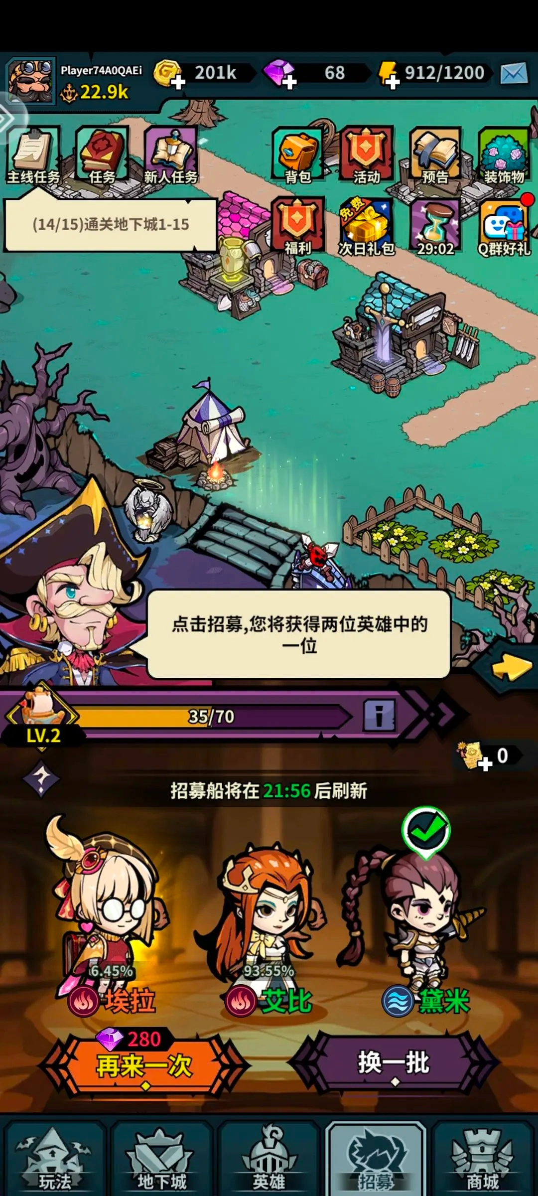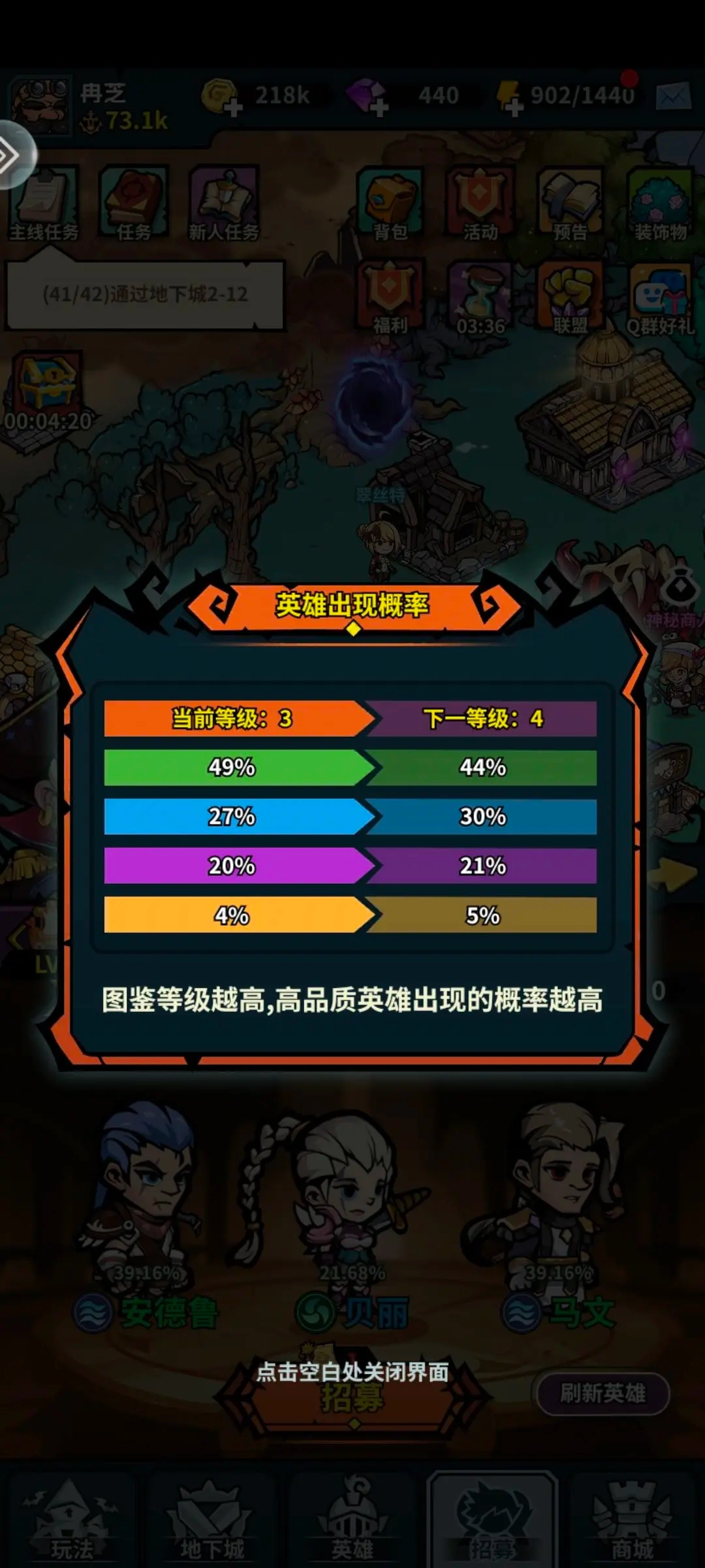 前期给了不少招募卷,大家只需要用一次招募卷然后进行下一批,在用招募卷。刷到第一个金可以用钻石拿下(前提是要攒600+钻石,第二次选择用200多钻石,第二次400多)有了金色的英雄刷怪场会很轻松,然后后面就正常刷招募卷,提升招募池等级。因为每次进行招募都会获得图鉴等级经验,图鉴等级提升后,稀有英雄及史诗英雄出现的概率将大大增加。