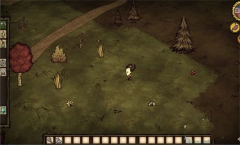 前期草、树枝、木头收集够一组即可沿着大路探路,路上有燧石和石头可以顺便捡起,记得采集看见的浆果或一些萝卜。