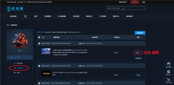 5、购买成功后,请点击网站右上角进入个人中心,在购买订单中查看订单状态。成功付款之后根据页面提示提取货。