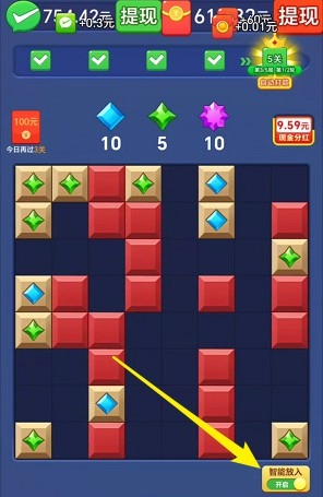 这款游戏采用拼方块的玩法,新人在第1关和第3关各能获得一个红包,到第4或第5关还能再拿到0.1的红包。游戏里的红包按万分比例兑换,通过的关卡越多,兑换比例就越高,所以是可以兑换的。