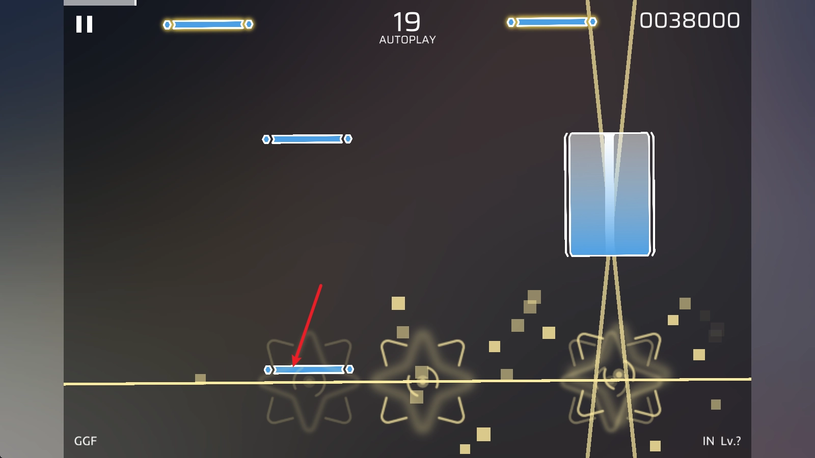 接下来是长按音符,也就是这种长柱形状的,要在它到达判定线时按住,一直到它消失为止。