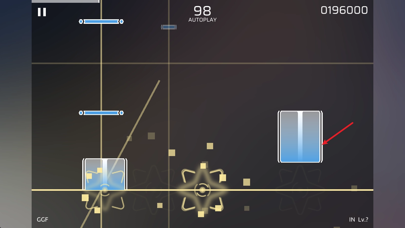 选好歌曲后就能开启挑战啦,首先得熟悉各类音符,第一种是最基础的点击音符,只要它落到判定线上时点击就行。