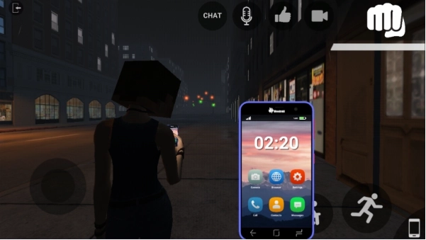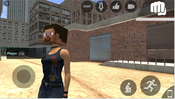 4、进入场景后,你可以先点击【CHAT】查看对话内容,通过左侧的虚拟摇杆来控制角色前后移动,右侧的按钮则分别用于蹲下和跳跃操作。