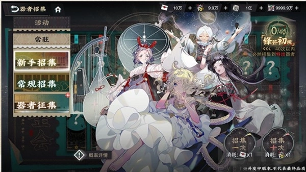 会有更多器者参与进来。在“招集”系统里,收藏家能够用“请调券”和“琳琅合券”,在活动卡池或者常驻卡池中招集器者。另外,也可以使用“征集信”来进行器者征集。