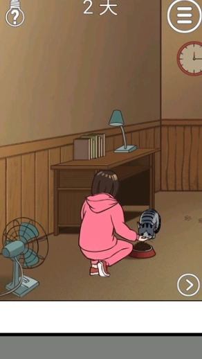 2、第二关:先打开柜子获取猫粮,接着把猫粮倒入左侧房间的碗中,以此吸引猫咪现身。
